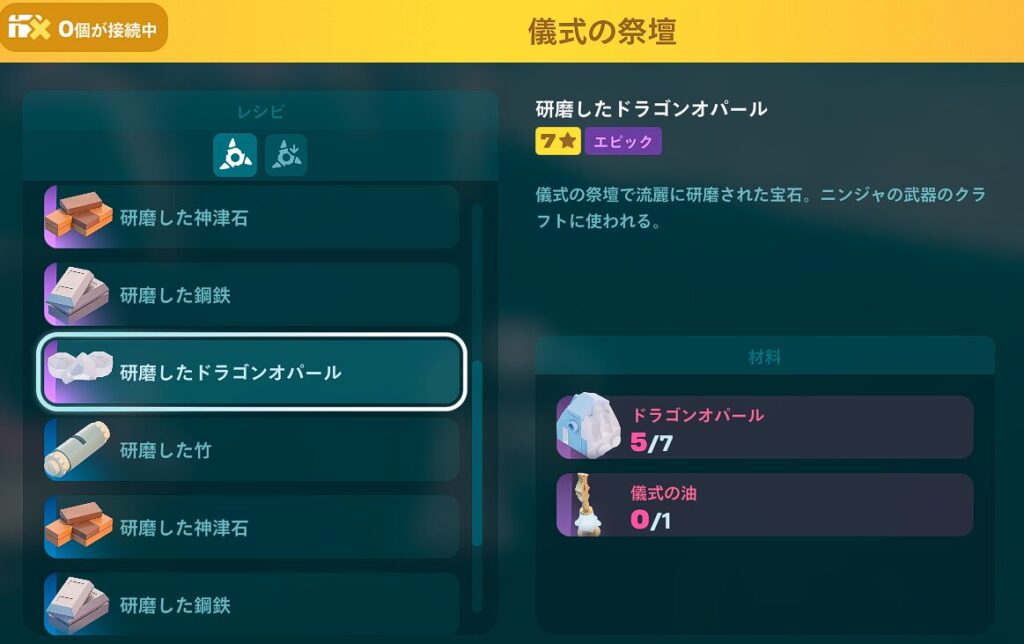 ドラゴンオパールは、ユーティリティ「儀式の祭壇」にて研磨ができます。研磨にはドラゴンオパールのほかに、儀式の油が必要です。