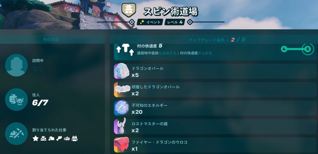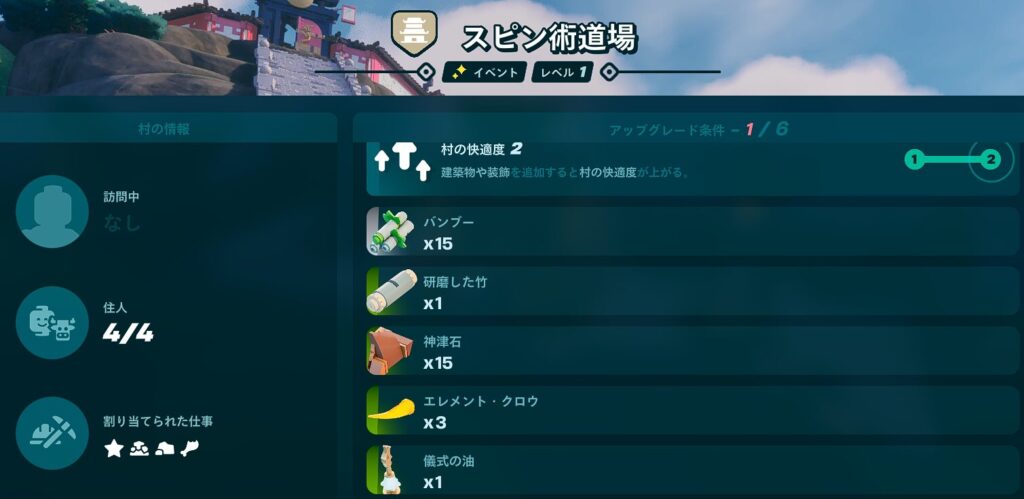スピン術道場にはすでに「村の広場」が置かれていて、レベル上げにはニンジャゴー島ならではの素材が求められます。