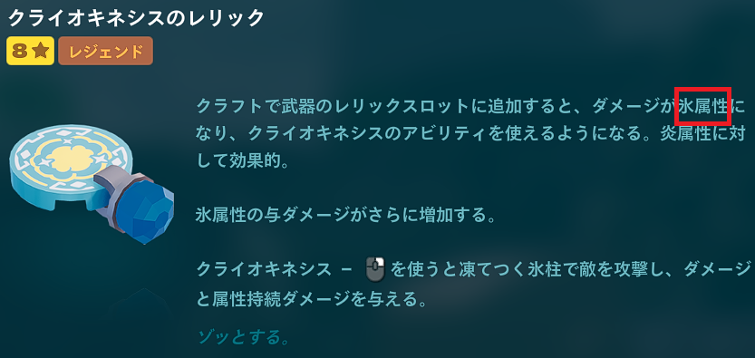 例えば画像のような、氷属性のレリックを付けた武器で炎属性の敵を攻撃すると、相性が良いので通常より多くのダメージを与えられます。