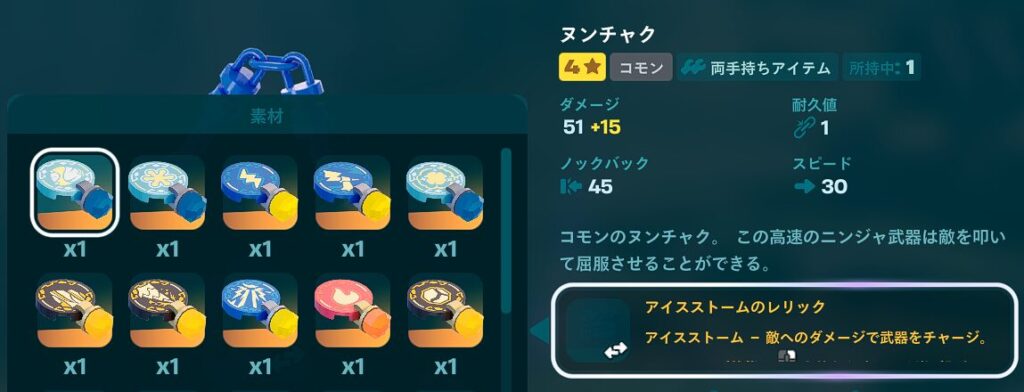 - ヌンチャク:凄まじい攻撃速度を誇る両手持ち武器。