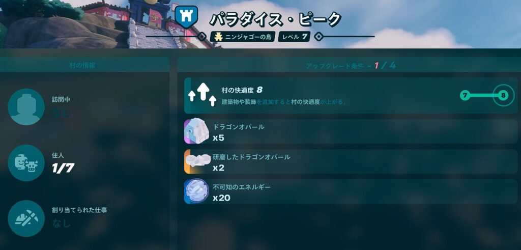 今回は、ニンジャゴーの島の村のアップグレード要件をまとめていきます。一部素材の入手方法はリンク先で解説しているので、良ければそちらもご覧ください。