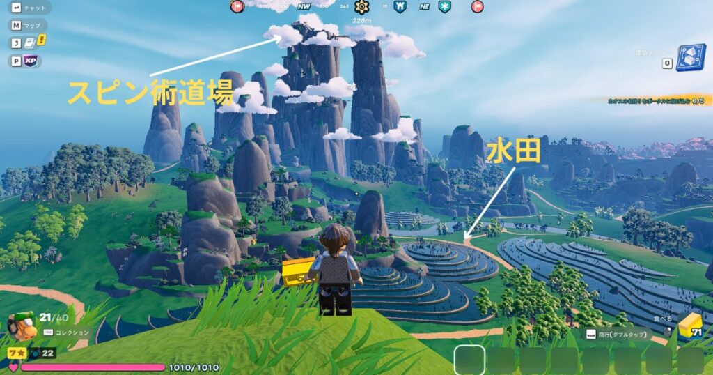 水田は、スカイワード・ステップ内なら基本的に少し歩き回っていれば見つけられますが、即効性を取るなら「スピン術道場」の真下周辺がおすすめです。