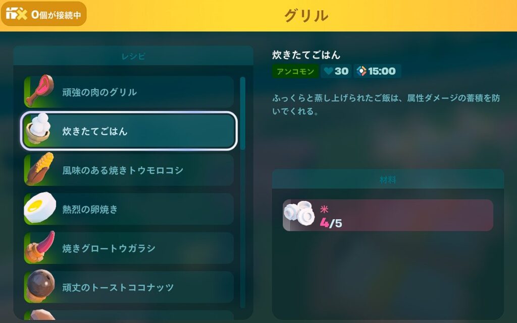 米は、ユーティリティ「グリル」で炊きたてごはんにクラフトできます。